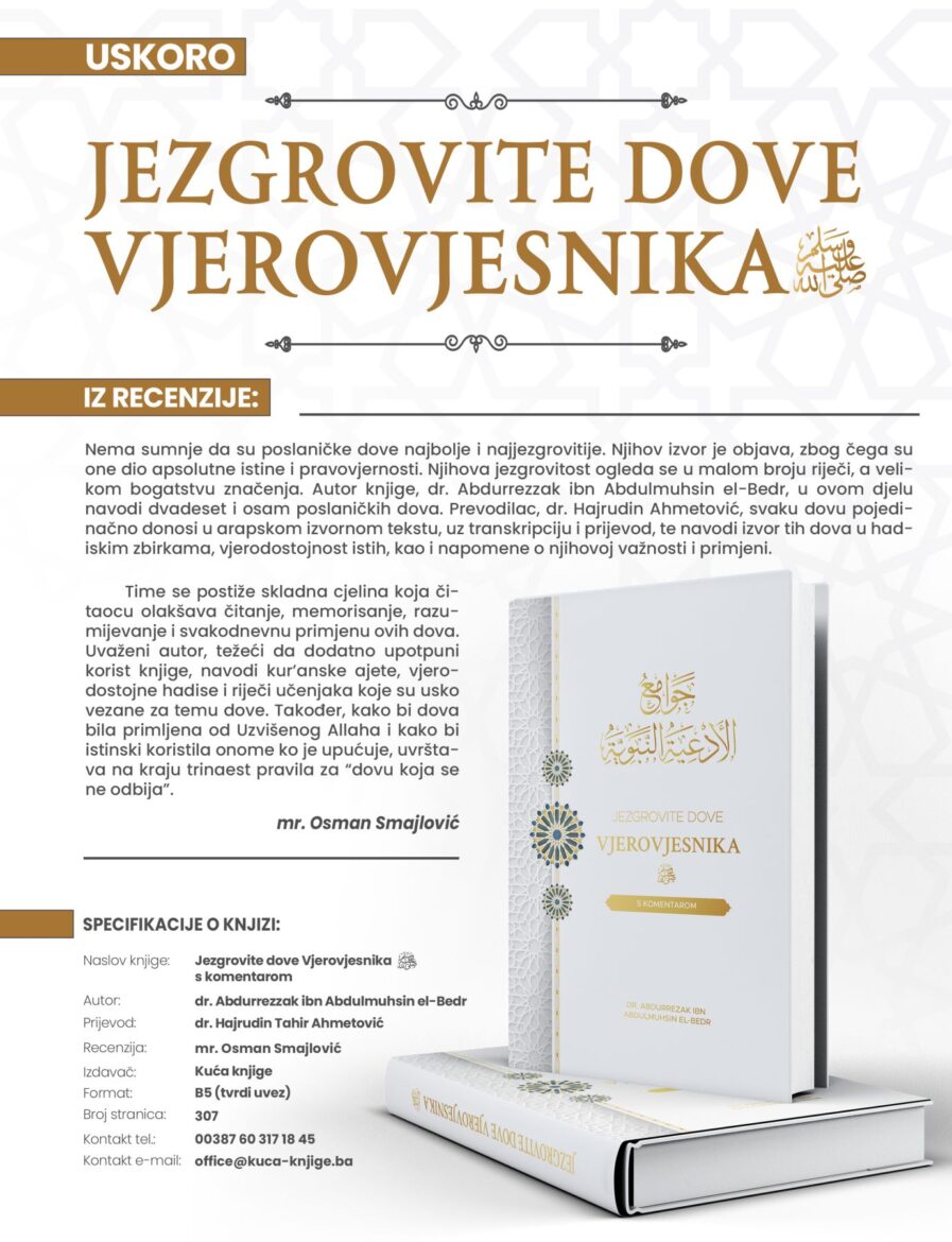 Nema sumnje da su poslaničke dove najbolje i najjezgrovitije. Njihov izvor je objava, zbog čega su one dio apsolutne istine i pravovjernosti. Njihova jezgrovitost ogleda se u malom broju riječi, a veli- kom bogatstvu značenja. Autor knjige, dr. Abdurrezzak ibn Abdulmuhsin el-Bedr, u ovom djelu navodi dvadeset i osam poslaničkih dova. Prevodilac, dr. Hajrudin Ahmetović, svaku dovu pojedinačno donosi u arapskom izvornom tekstu, uz transkripciju i prijevod, te navodi izvor tih dova u hadiskim zbirkama, vjerodostojnost istih, kao i napomene o njihovoj važnosti i primjeni.